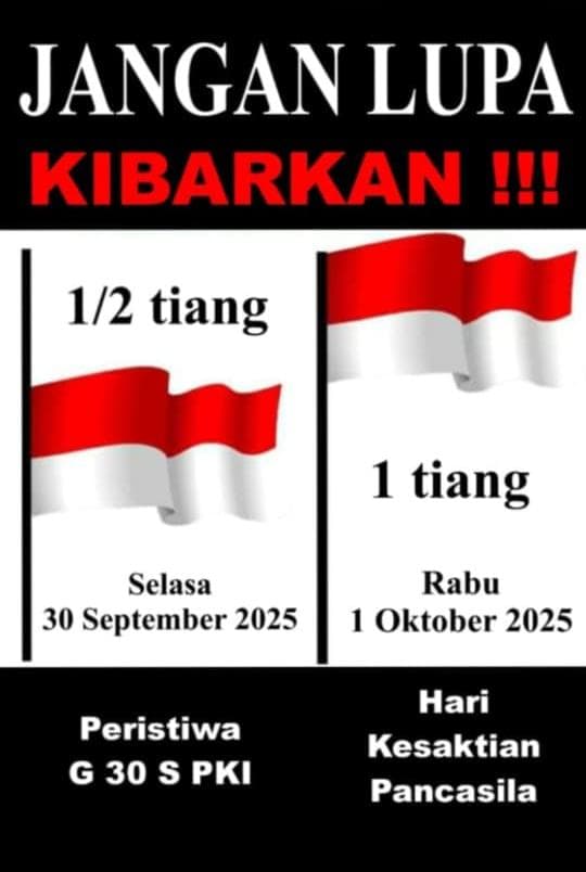 Podosari - Dalam rangka mengenang Peristiwa G30S/PKI, Diinformasikan kepada seluruh warga masyarakat Desa Podosari, untuk mengibarkan Bendera Merah Putih Setengah Tiang pada ;
